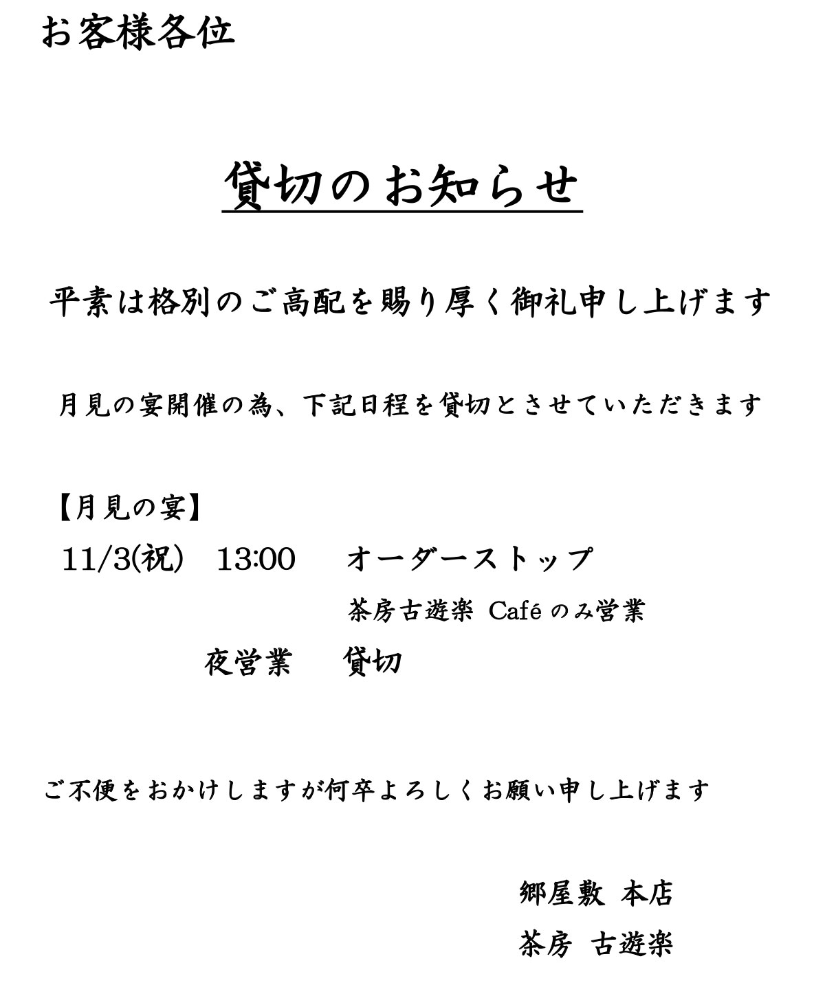 11月3日(祝)夜営業 (17:30~21:00) 貸切とさせていただきます。