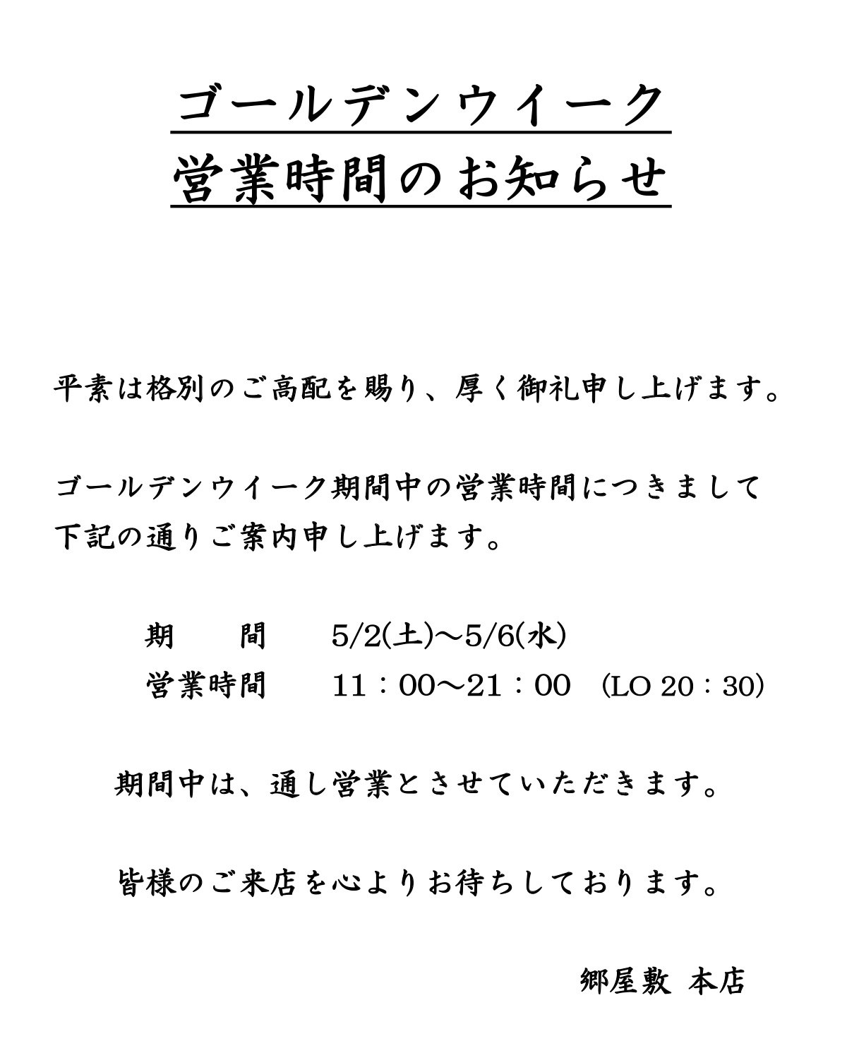 ゴールデンウイーク営業時間のお知らせ